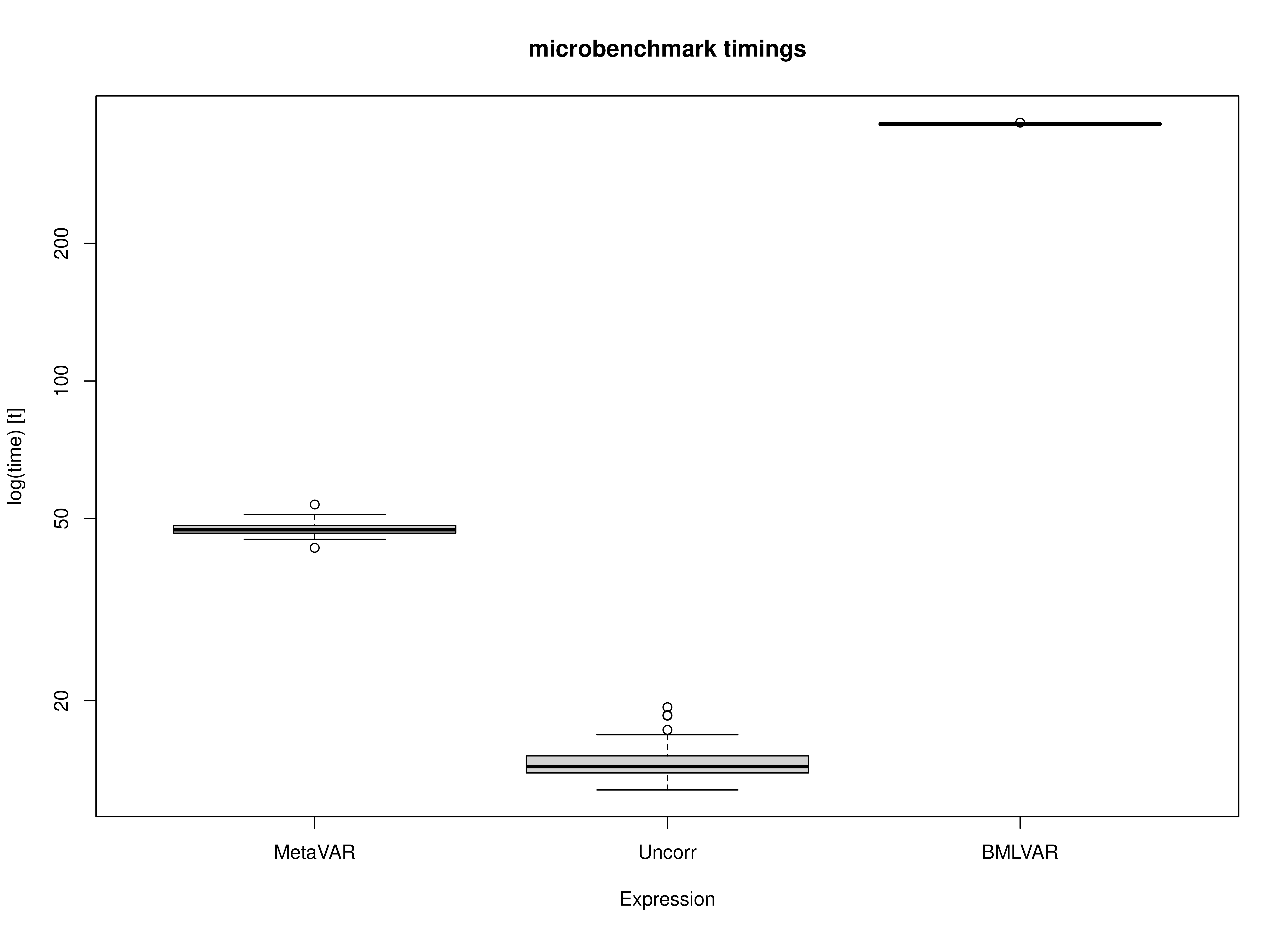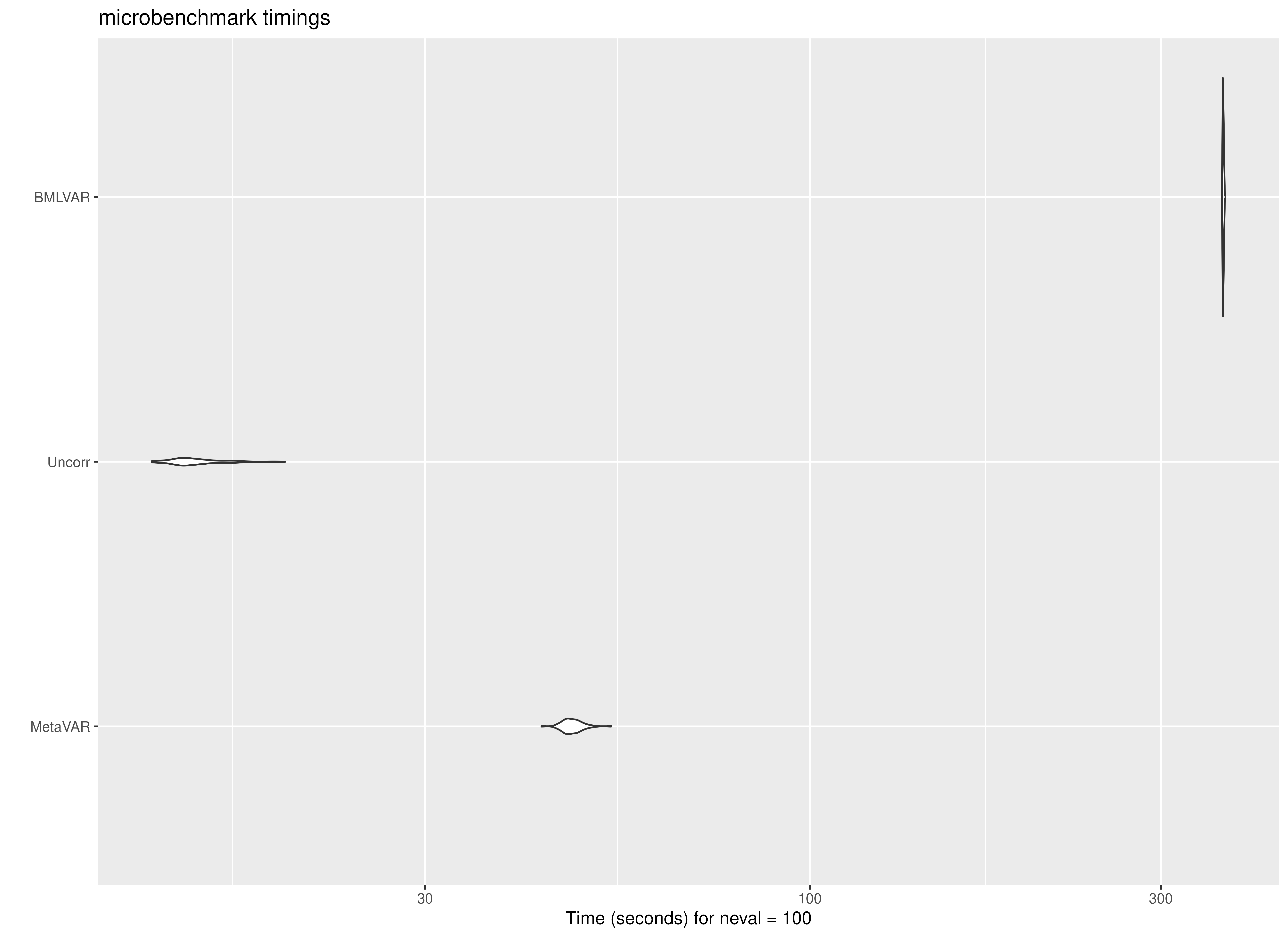 #> 3 BMLVAR 362.99736 364.08500 364.60915 364.48380 365.05887 367.14739 100Summary of Benchmark Results Relative to the Fastest Method