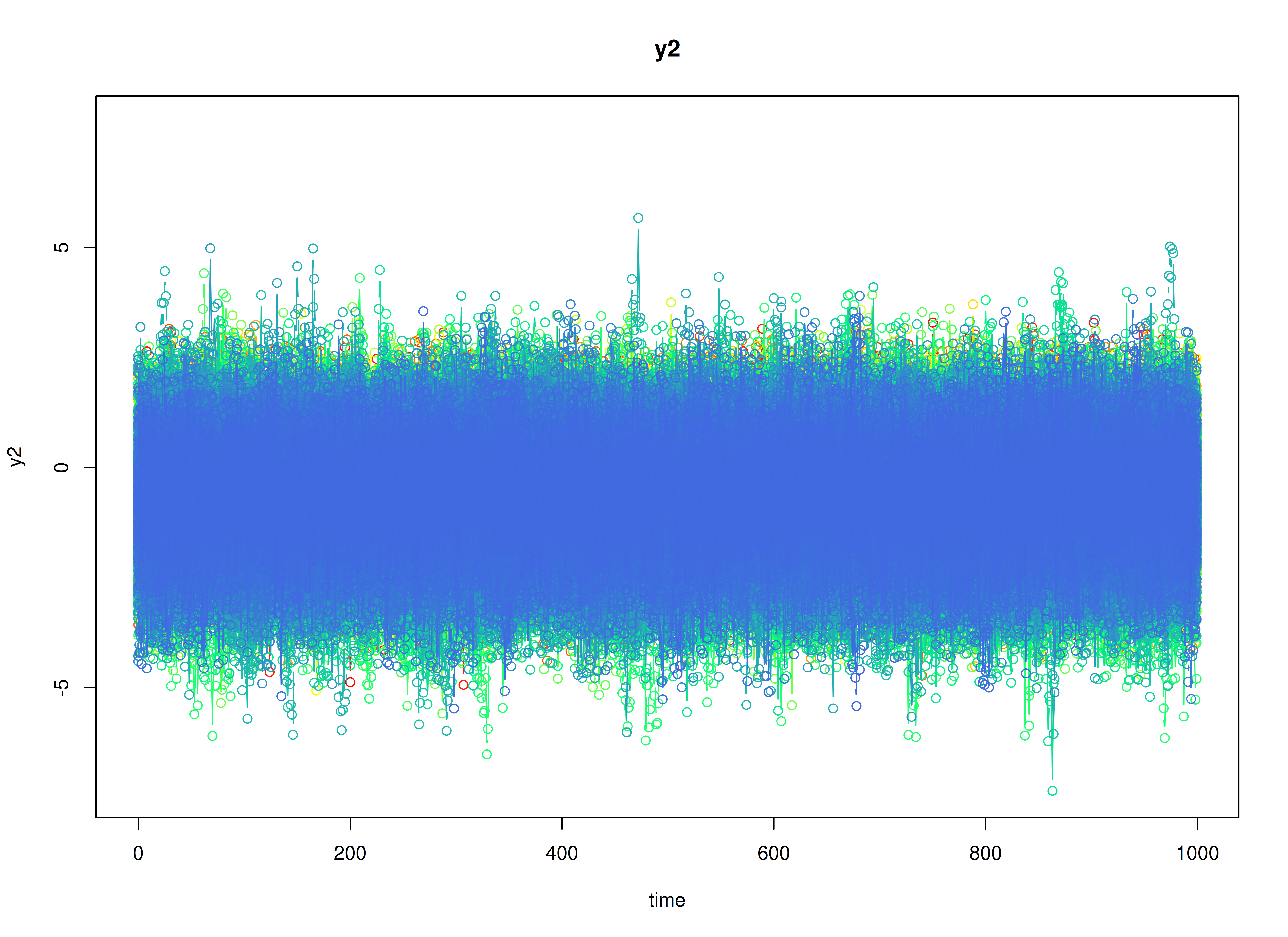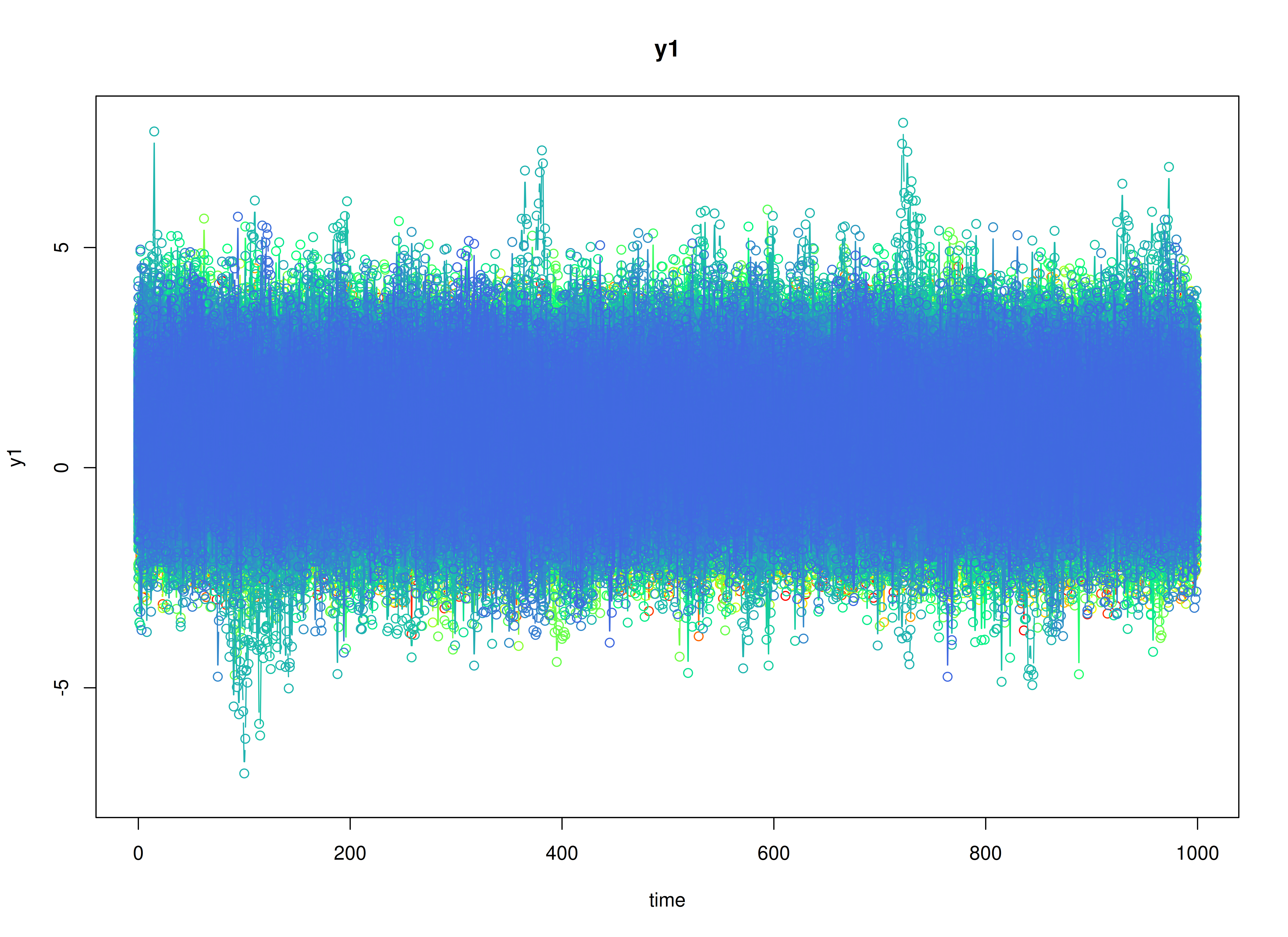 Let be the number of time points and be the number of individuals. We simulate a total of time points per individual, discarding the first as burn-in. The analysis uses the final measurement occasions.