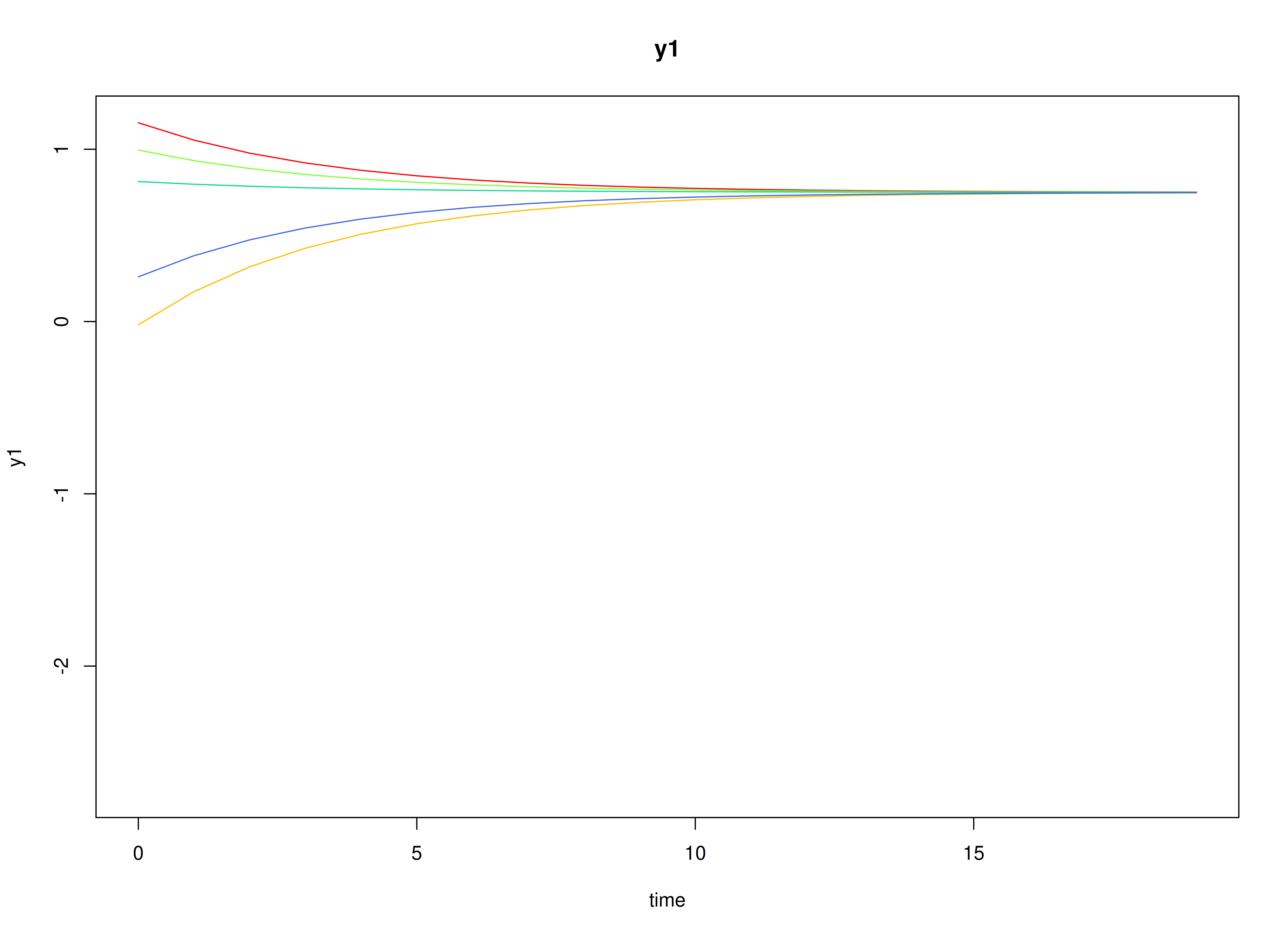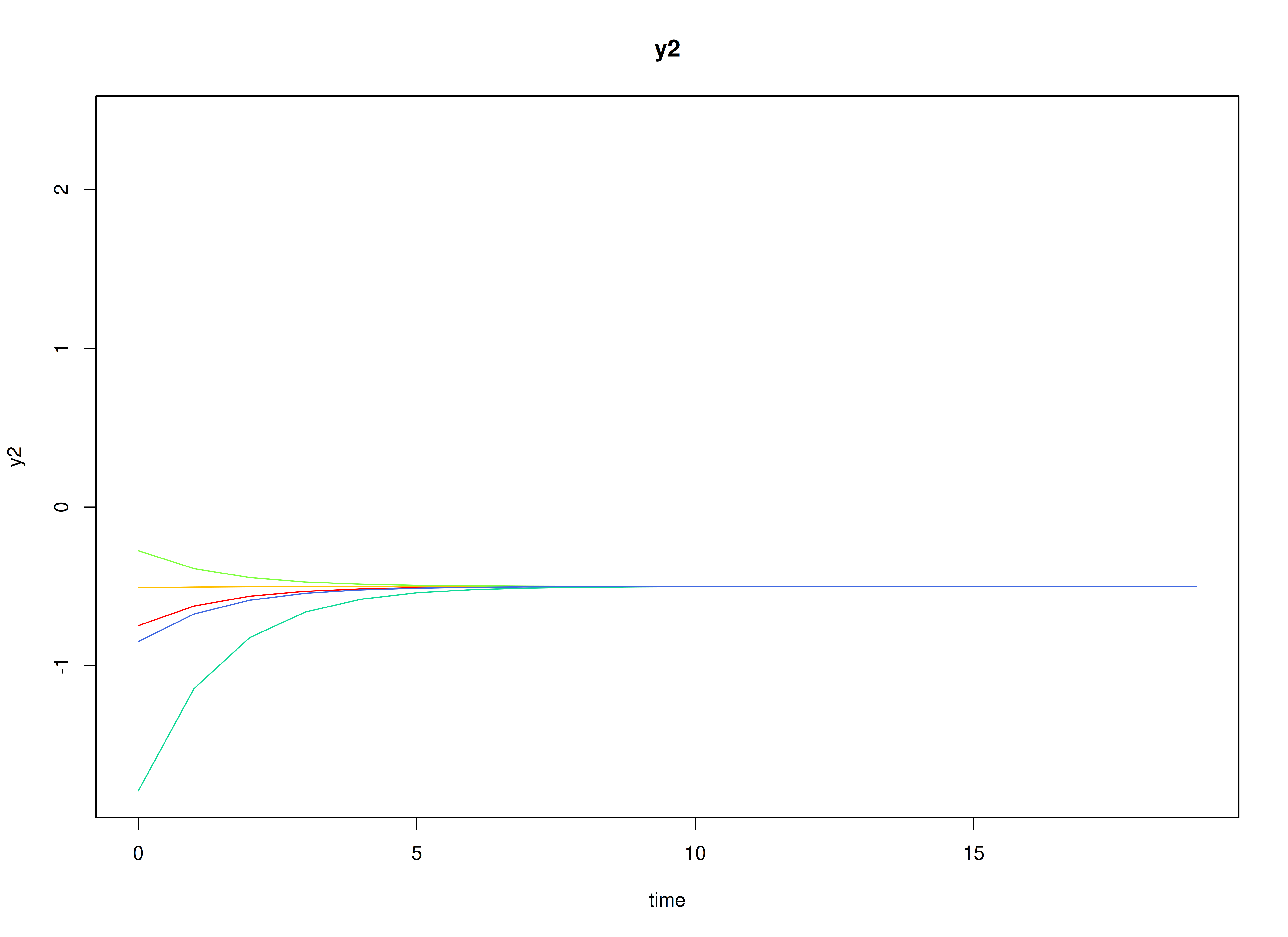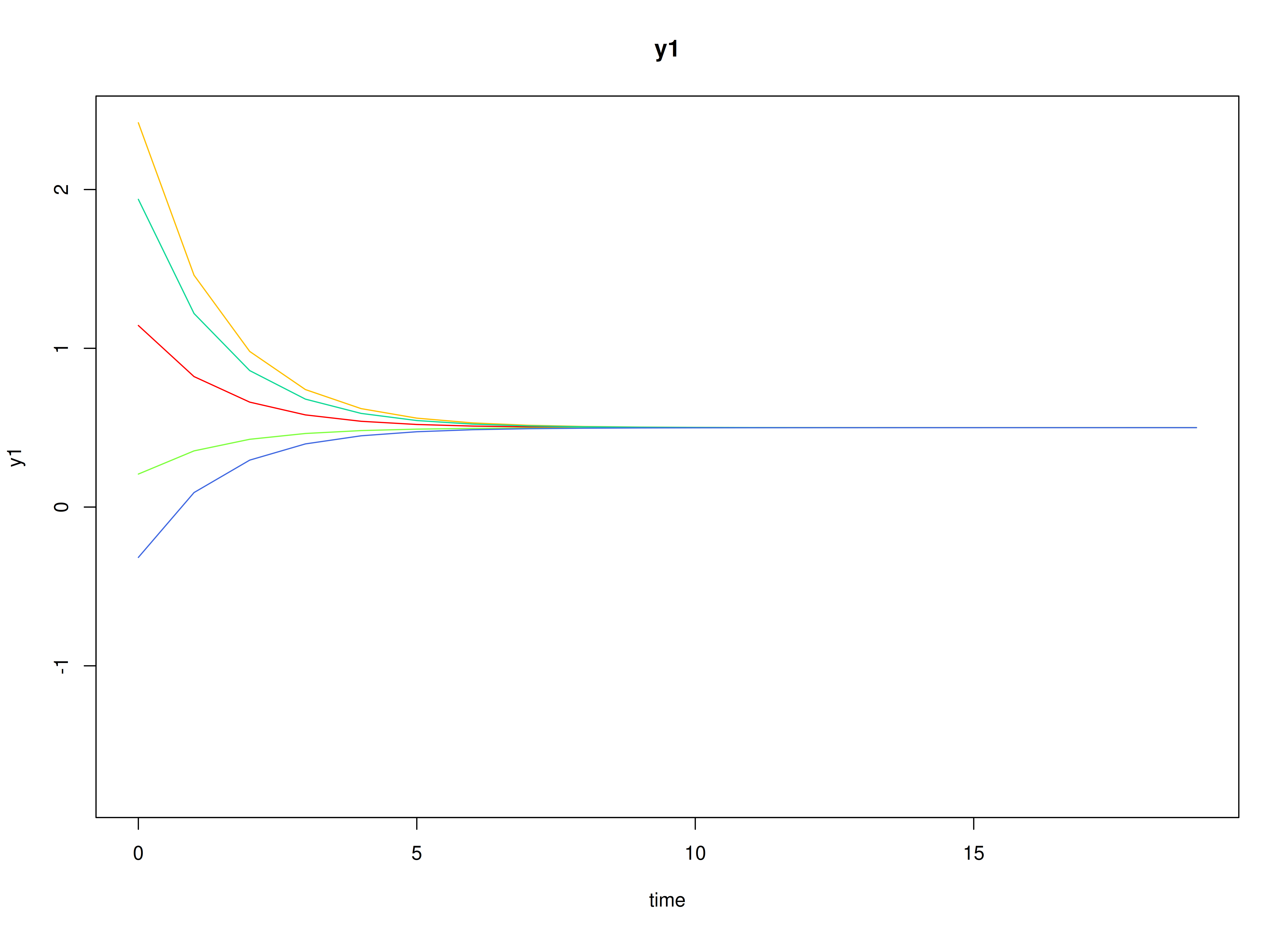 #> [2,] 0.0000000 0.7071068Visualizing the Dynamics Without Process Noise and Measurement Error (n = 5 with Different Initial Condition)